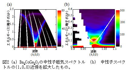 のスピン・ネマティック相互作用項であることを見出しました。たとえば、図1(b)のようにOXY 相関が反強的な場合には、磁気異方性は[100]方向となり、電気分極は反強誘電的となります。このことは、磁気異方性の測定はスピン・ネマティック相関の測定と等価であり、さらに異方性エネルギーの測定によりスピン・ネマティック相互作用定数と電気分極の誘電エネルギーの測定が可能になることを意味します。そこで次に、中性子非弾性散乱実験による磁気スペクトルの収集と、SQUID磁束計による磁化率曲線の測定を行いました。図1(a)の磁気スペクトルに示されるように、Q=(1,0,0)から反強磁性スピン波が立ち上がる様子が観測されます。Q=(1,0,0)近傍を拡大すると、図2(b)のように、0.1 meV程度の明瞭な異方性ギャップが観測されました。このスペクトルを、スピン・ネマティック相互作用を入れたスピン・ハミルトニアンで解析すると、白線のように実験結果がよく説明されました。このことから、Ba2CoGe2O7においてスピン・ネマティック相互作用が存在していることが明らかになりました。スピン・ネマティック相互作用定数の大きさは0.198meVと見積もられました。このエネルギーは、電気分極の静電エネルギーにもなっています。