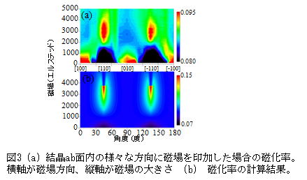ab面内の様々な方向に磁場を印加した場合の磁化率が図3(a)に示されています。磁場印加方向が[110]及び[1-10]方向である場合に、スピンフロップ転移による磁化率の増大がH=3000 Oe近傍で観測されています。この4回対称な振る舞いは、磁気異方性項としてOXY